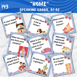 Каждая карточка содержит вопросы на тему «Home», которые подходят для учеников уровней A1 - A2.