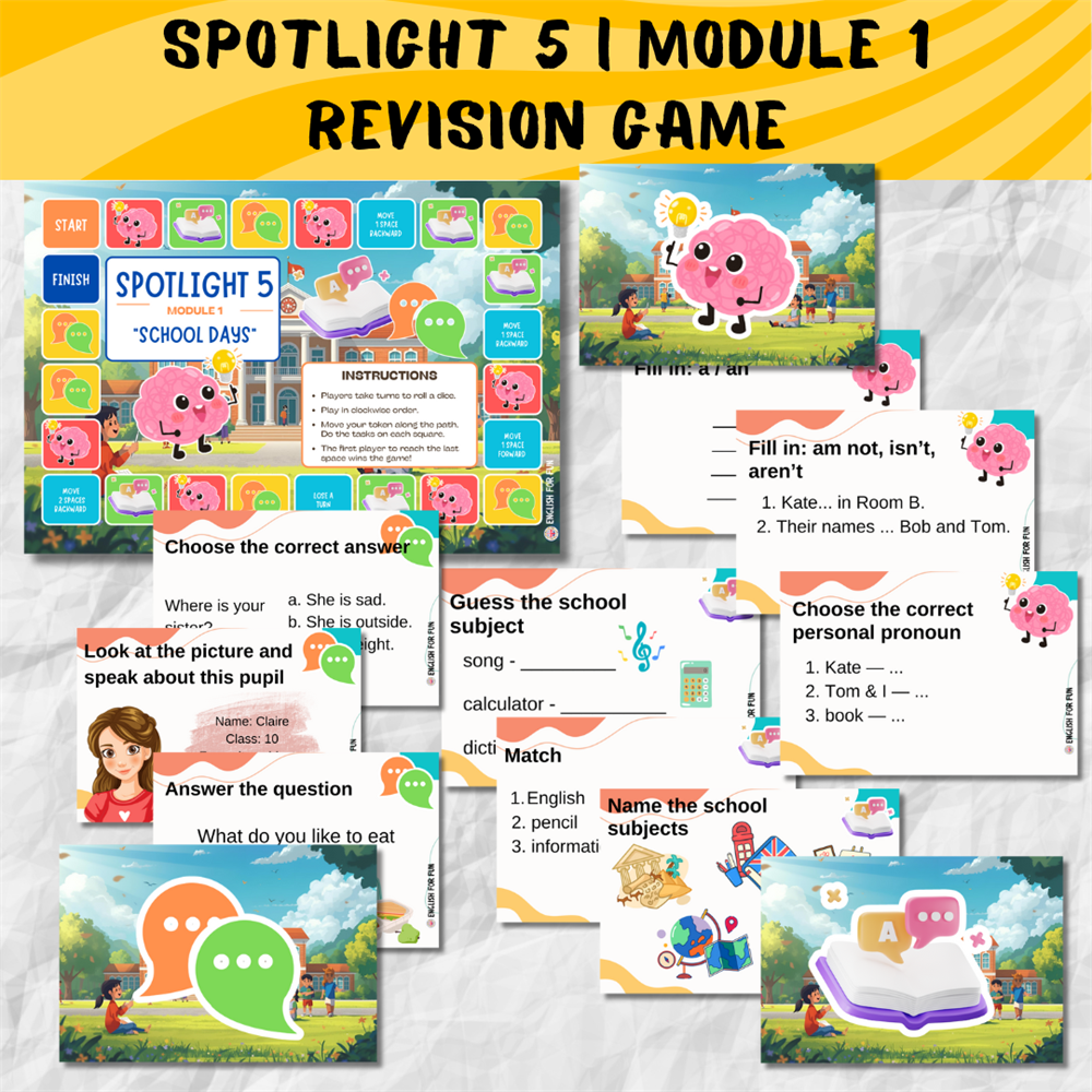 В настольную игру входит три категории заданий: грамматические , лексические и задания на говорение. С помощью данной игры вы проработаете и еще раз вспомните весь материал, изученный в модуле 1 УМК Spotlight 5. Данная разработка - прекрасный способ в непринужденной форме подготовить ваших ребят к контрольной работе или просто вспомнить пройденный материал в необычном формате.